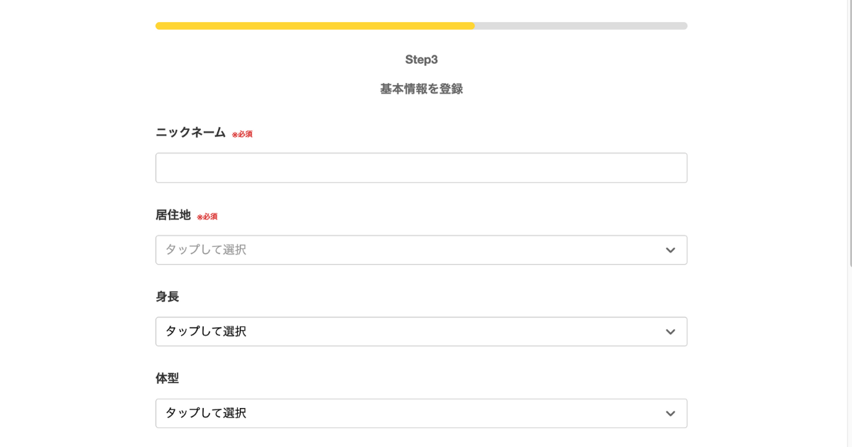 プロフィールには、ニックネームや居住地、自己紹介文などの基本情報を入力します。この段階でプロフィール写真の登録も可能です。